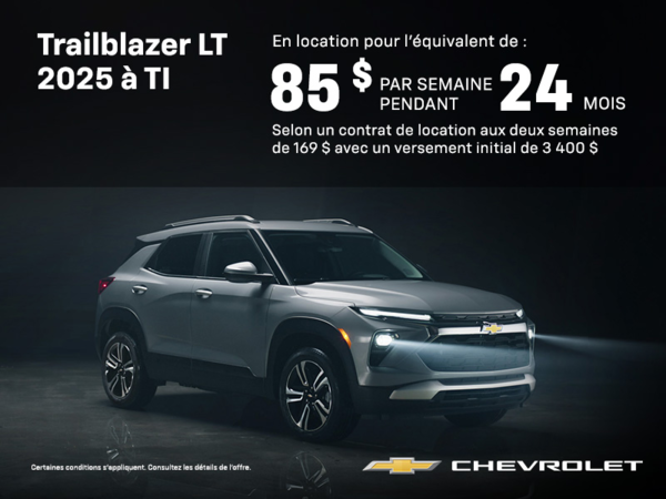 L'offre d'achat au comptant est basée sur le modèle 2025 CHEVROLET Trailblazer ACTIV TI (1TX56 4981d459edc3), avec moteur 1,3L 3 cyl. et transmission Automatique 9 vitesses. Le prix de vente à l'achat au comptant est de 34 514,00 $ (plus taxes). Le prix de vente (34 514,00 $) à l'achat au comptant inclut les rabais: Comptant - Non Empilable (NSC) (2 000,00 $). Le prix de vente (34 514,00 $) à l'achat au comptant inclut: Transport et Préparation (2 300,00 $), Taxe d'accise sur le climatiseur (100,00 $), Taxe sur les pneus (15,00 $) installation comprise. Plus (TVH) et immatriculation. L'offre de financement est basée sur le modèle 2025 CHEVROLET Trailblazer ACTIV TI (1TX56 4981d459edc3), avec moteur 1,3L 3 cyl. et transmission Automatique 9 vitesses. Offre de financement d'une periode limitée sur approbation de crédit. Les taux et les exigences peuvent varier en fonction de la solvabilité. Les paiements et conditions peuvent différer pour une utilisation commerciale. Certains client ne pourront se qualifier. Les taxes applicables sont calculées sur le montant total avant déduction de l'acompte. Le prix de vente en financement est de 36 514,00 $ (taxes en sus). Les paiements en financement incluent: Transport et Préparation (2 300,00 $), Taxe d'accise sur le climatiseur (100,00 $), Taxe sur les pneus (15,00 $) installation comprise. L'offre de financement est basée sur un terme de 84 mois avec un taux d'intérêt de 3,99%. Les 364 paiements à la semaine de 115,01 $ (132,26 $ taxes incluses) incluent un acompte de 0,00 $ et un échange net de 0,00 $. Les acomptes sont dus à la livraison du véhicule. Les crédits de taxes pour l'échange sont soumis à une preuve de propriété. L’obligation totale en financement est de 48 142,64 $ (taxes comprises). Les frais de crédit totaux en financement sont de 8 451,54 $. Le taux annuel en pourcentage (TAP) est de 5,69%. L'offre de location est basée sur le modèle 2025 CHEVROLET Trailblazer ACTIV TI (1TX56 4981d459edc3), avec moteur 1,3L 3 cyl. et transmission Automatique 9 vitesses. Offre de location d'une periode limitée sur approbation de crédit. Les taux et les exigences peuvent varier en fonction de la solvabilité. Les paiements et conditions peuvent différer pour une utilisation commerciale. Certains client ne pourront se qualifier. Les taxes sur le comptant initial et les rabais après taxes (incluant les rabais du gouvernement) sont exclues et doivent être payées à la livraison. Le prix de vente en location est de 36 514,00 $ (taxes en sus). Les paiements en location incluent: Transport et Préparation (2 300,00 $), Taxe d'accise sur le climatiseur (100,00 $), Taxe sur les pneus (15,00 $) installation comprise. L'offre de location est basée sur un terme de 60 mois avec un taux d'intérêt de 2,9%. Les 260 paiements à la semaine de 109,09 $ (125,45 $ taxes incluses) incluent un acompte de 0,00 $ et un échange net de 0,00 $. Les acomptes sont dus à la livraison du véhicule. L'acompte de 0,00 $ et la taxe sur l'acompte, l'échange net de 0,00 $ et le premier paiement de 125,45 $ sont dûs au début du bail. Le montant total dû au début du bail est 125,45 $ (Acompte de 0,00 $, Premier paiement (125,45 $) et (TVH) 0,00 $). Les crédits de taxes pour l'échange sont soumis à une preuve de propriété. L'offre de location est basé sur un plan de kilométrage de 20000 km par année. Des frais de 0,16 $ par kilomètre supplémentaire seront applicables. La valeur résiduelle estimée est de 11 679,68 $. Une option d'achat à la fin de la location pourrait être disponible (Valeur de Rachat) au montant de 11 679,68 $. Un dépôt de sécurité pourrait être requis. L’obligation totale en location est de 32 617,00 $ (taxes comprises). Les frais de crédit totaux en location sont de 5 529,08 $. Le taux annuel en pourcentage (TAP) est de 4,71%. Immatriculation, assurance, enregistrement, options additionnelles et taxes applicables sont en sus. Le véhicule illustré est basé sur le modèle 2025 CHEVROLET Trailblazer ACTIV TI (1TX56 1SA), avec moteur 1,3L 3 cyl. et transmission Automatique 9 vitesses. Le prix de vente à l'achat au comptant du véhicule illustré est de 34 514,00 $. Les détails de prix sont à titre informatif seulement et ne sont pas destinés à être une offre d'achat. Les montants indiqués n'incluent pas les frais d'immatriculation, l'enregistrement, l'assurance et certains autres frais (par exemple, les produits ou services facultatifs mis à votre disposition).